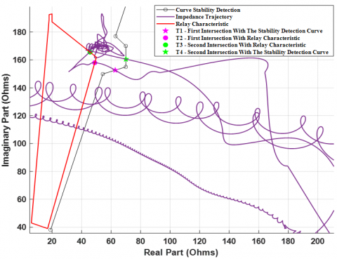 In the event of a load loss or a malfunction in the protection scheme, remedial actions—such as disconnecting the line or isolating the faulted section are applied. Figure 2 shows, in red, the time-domain characteristic of the planned impedance element for a 700 km transmission line. This characteristic extends over 20%-80% of the line length and is represented by a quadrilateral zone. The inclined black boundary indicates the suggested stability limit and offers an early signal of whether the system, immediately after a fault, is moving toward a stable or unstable power swing. During the fault, the observed impedance trajectory (violet) is taken as the reference signal in the proposed approach, allowing both fault identification and assessment of whether the path tends toward a stable or unstable region. Although not central to this work, the purple star designates the first intersection (T1) with the stability margin. It also marks the entrance instant (T2) into the distance-relay zone, while the green marker corresponds to the exit instant (T3). The time span between T2 and T3 reflects the relay’s fault sensitivity. The green star then highlights the second crossing with the suggested stability–swing boundary, denoted T4, and the interval ΔT = T4 − T2 is applied to evaluate the power-swing status of the system, indicating if it is moving toward stability or instability.