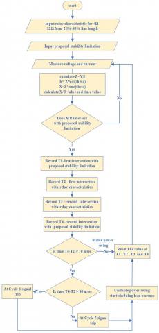 The present study proposes a line or curve for the stability constraints that indicate the occurrence of a malfunction. The approach proposed here begins by first locking the relay characteristic and the stability limits. When a severe disturbance or fault occurs, the X/R ratio surpasses the stability threshold, and the first intersection with the stability boundary labelled as T1 is recorded. Afterwards, the X/R trajectory keeps shifting until it enters the relay zone, where the initial crossing (T2) is logged as the fault-detection instant. The X/R value continues to change until it goes beyond the relay-zone limits, at which moment the second crossing of the relay characteristic is registered as T3. Relay fault-detection sensitivity is assessed using the interval T3–T2. A larger T3–T2 implies higher relay sensitivity. Until it crosses the stability limits once again, the value of X/R keeps changing automatically; at that time, the second intersection denoted T4 is recorded. Then compute ΔT = T4 − T2. If ΔT lies in 70–80 ms and T4 is in 80–90 ms, it indicates that the critical swing occurs in the fifth cycle, which is the proposed stability threshold at which the isolation signal will be sent. If instead ΔT is 80–90 ms and T4 exceeds 100 ms, it indicates that the critical swing occurs in the sixth cycle. The proposed stability threshold will shift to the sixth cycle instead of the fifth. Subsequently, the regulated load isolation procedures will begin to avoid losing synchronisation. The system will then be monitored to see if the isolation procedures have led to system stability. If the answer is yes, the load will be returned to the system after it stabilizes. In case of failure, a command will be given to disconnect the lines to avoid damage caused by losing synchronisation. If ΔT < 70 ms, the timestamps are cleared and the evaluation is repeated until the criterion is satisfied. Figure 3 illustrates these operations in the form of a flowchart.