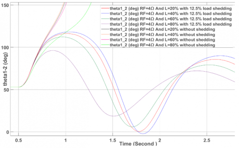 The effectiveness of the proposed protection system was evaluated through an additional scenario, where Figure 14 shows the difference between the power angles of the two machines (Theta1 - Theta2) at a fault resistance of 8 ohms, with fault locations varying between 20% and 80% of the line length, and the fault lasting for 7 cycles. The results were presented in two cases: the first using the proposed protection method to shed loads by 5% of the total load, and the second in the absence of any load shedding. The shedding percentage was deliberately reduced in this scenario to test the system's ability to handle cases where the shedding strategy fails to mitigate power swings. The results showed that the primary protection successfully isolated the main lines within fault locations ranging from 20% to 60% of the line length, thereby avoiding catastrophic damage caused by loss of synchronisation when the shedding strategy failed to mitigate power swings. However, it was observed that the shedding strategy mitigated power swings at a fault location of 80% of the line length. This success is attributed to the additional line impedance resulting from the increased distance of the fault location, reducing power swings' impact. Moreover, the time required for opening the circuit breakers was considered, with a delay of 30 milliseconds added to ensure compatibility with the practical requirements of protection systems.