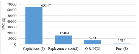 The main economic indicators calculated by HOMER and used to rank the solutions are: net present cost (NPC), cost of energy (COE) and investment/replacement/operating costs. The NPV represents the discounted sum of all project lifetime costs, including initial investment, replacement, fuel, O&M and other expenses.