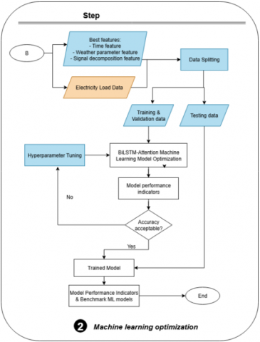 The decomposed weather signals, together with temporal indicators and electricity load data, are used as inputs for the Bi-LSTM with Attention model. The dataset is split into training and testing sets to evaluate the model’s predictive skill, while hyperparameter tuning is applied to further optimize its performance. By integrating pre-selection of weather variables with wavelet-based decomposition and an attention-augmented recurrent neural network, the proposed approach aims to achieve accurate and reliable electricity load forecasting.