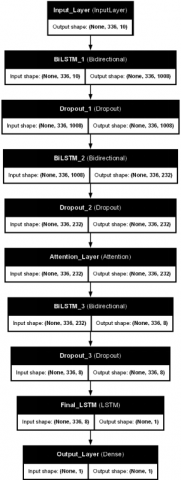 In the BiLSTM with Attention model, the process starts with a Bidirectional LSTM layer. This layer extracts information from both directions of the time sequence. Next, a Dropout layer reduces the risk of overfitting. A second Bidirectional LSTM deepens the representation of temporal features, and another Dropout layer follows it. Then, an Attention layer highlights important features in the data sequence. The results are processed by a third Bidirectional LSTM, which is also followed by Dropout to maintain learning stability. Finally, the output layer produces the final prediction value. The sequence of this architectural model is shown in the Figure 4.