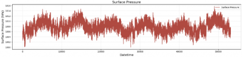 The weather dataset was obtained from the ERA5 reanalysis provided by ECMWF, covering the Bali region (8.25°S-8.75°S, 115°E-115.5°E) with an hourly temporal resolution from 1 January 2022 to 23 January 2024. The parameters include air temperature at 2 m (t2m), surface solar radiation (ssrd), wind speed (wnd), and surface pressure (spr). Figures 6-9 show the plot weather parameter. Missing or incomplete records (less than 1.5% of the total samples) were handled by linear interpolation to maintain temporal continuity. All weather variables were normalized using min–max scaling before being fed into the model.