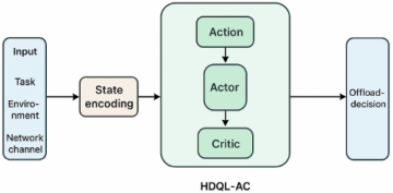 The HDQL-AC framework combines the value-based learning process of the DQN with the policy-gradient stability of the Actor−Critic. The DQN is able to estimate Q-values for initial offloading decisions, while the actor–critic is refining the action policy in order to maximize long-term QoS rewards. The actor outputs the continuous probability distributions over the tasks, while the critic evaluates them through reward feedback. The combined loss function can be seen in Eq. (24) with αbalancing value and policy gradients.