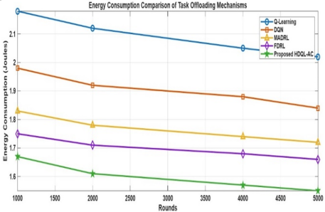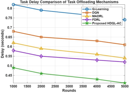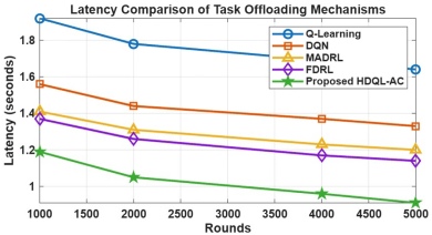 The HDQL-AC converges in around 1800 rounds while the others take more than 3000 rounds to reach convergence. Notably, these results show a vastly improved learning efficiency. The average decision-making time for HDQL-AC was at 46 ms, when compared to DQN- 71 ms and FDRL- 65 ms and hence, it was still within real-time offloading requirements. This confirms the proposed model's efficacy in QOS aware task offloading.