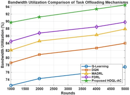 Bandwidth utilization quantifies how effectively communication resources are utilized during offloading. Efficient offloading lessens the number of retransmissions and the wasted bandwidth on idle resources. HDQL-AC optimizes both task allocations and resources to sustain a higher level for percentage of effective bandwidth usage. The Actor module ensures that only the potential fog nodes are notified of the offloaded task, thus decreasing redundant transmission. The hybrid model reaches 94.5% utilization after 5000 rounds, which demonstrates an effective and efficiency management of spectrum, and better mitigation of network congestion as shown in Table 3 and Figure 4.