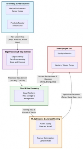 Our approach treats the system as a closed-loop, instrumented process: (i) marine monitoring provides short-term forecasts of plastic availability; (ii) a sensor-rich, low-temperature thermocatalytic reactor offers real-time observability of temperature, pressure (including vacuum), and flows; and (iii) machine-learning optimization tunes ramp rates, dwell times, vacuum level, and carrier-gas flow to maximize liquid yield and minimize specific energy consumption. All signals stream through an IoT pipeline (edge compute, MQTT/HTTP transport, cloud dashboard) with store-and-forward buffering to handle intermittent connectivity typical of coastal sites.