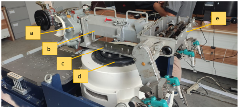 Figure 16. Complete test structure of the modular transmission neck. Main transmission (a), transmission neck frame (b), mounting stand (c), head expander (d), and feeding transmission (e)