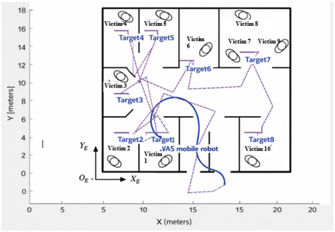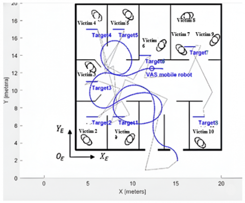 The advanced robot mobile moves looking for victims in room 6. An illustration of route planning and mobile robot movement, like Figure 12.