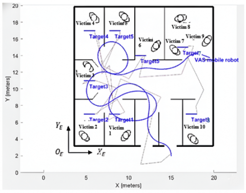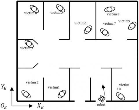 Figure 1 illustrates a situation when a mobile robot operates in an indoor structured environment that has several rooms and contains some possible people to be victims. Environment with structured configuration is represented in a cartesian coordinate system $\left\{O_E, X_E, Y_E\right\}$. There are ten possible persons to be victims that spread in several rooms. Each victim and robot are labelled. The arrow of the robot indicates the trajectory that guides it to each victim.