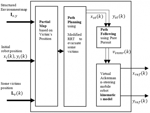This research proposes a modified rapidly exploring random tree (RRT) based on the virtual non-holonomic mobile robot (VNMR). The design of the proposed method is presented in Figure 2. There are three subsystems in this proposed system, shown in Figure 2. These subsystems are path planning, path following, and virtual plant. The path planning subsystem creates the path connecting the robot's initial position to several victims and the exit point. This path is forced to comprise some sharp turns to connect these points within a short distance. To generate this guide path, this research modifies RRT to plan an entire route from the entry point to several victim positions and the exit location.
