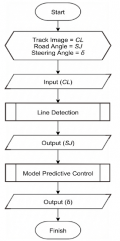 Explained in the system flowchart Figure 3, there is a declaration of variables to be used consisting of "Trajectory Image = CL", "Road Angle = SJ", and "Steering Angle = δ ". After the variable declaration, there is "INPUT (CL)", where the camera takes real-time recordings. The trajectory image that has been detected by the camera is immediately processed in "Line Detection", where this process will search for road boundaries and update the angle of change of the road. After the angle of change of the road is obtained, the angle of the road will be processed by "MPC" to predict how many degrees the steering angle will change so that the mobile robot does not leave the track. Then we get "OUTPUT (δ)" which will direct the robot to stay on its path, and the system is complete.