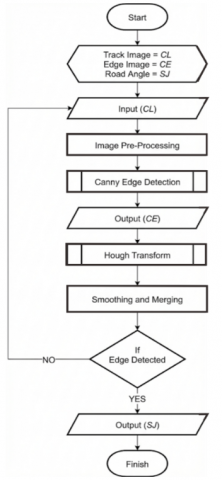 The system in digital image processing, where the camera detects the road and is processed in the line detection flowchart Figure 4. The system starts from the declaration of the variables "Edge Image = CE", and "Road Angle = SJ". Followed by "Image Pre-processing" where the image of the path will be improved image quality and remove noise in the image. After that the image will be processed in "Canny Edge Detection", where the road image will be taken only the edge of the road to determine the boundaries and shape of the path. After the edge of the road is known, it will be processed again using the "Hough Transform", in this process, the image will be drawn a straight line to determine the change in the angle of the road. After both are obtained, namely the edge boundary and the angle of the road, the results will be filtered and combined. To reduce the occurrence of unwanted detection, it is continued with conditioning, namely, whether the edge is detected. If the edge of the path is not detected, the system is restarted from "INPUT (CL)". And if the edge of the path is detected, then "OUTPUT (SJ)" is obtained, and the line detection process is complete.