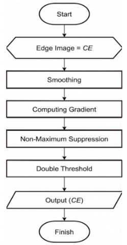 Figure 5 shows the flowchart of Canny edge detection, starting with the declaration of the variable “Citra Edge = CE”, followed by image smoothing using a Gaussian filter to reduce noise. Next, “Computing Gradient” is used to obtain the edge direction. After that, the non-maximum Suppression is performed to preserve edge peaks, followed by “Double Threshold” to identify strong and weak edges. Weak edges connected to strong edges are preserved. The result is a clear edge image, and the process is complete.
