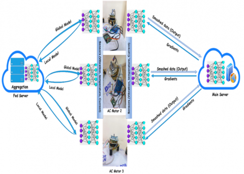 With regard to PdM applications in industrial settings, the suggested framework offers an SFL architecture. A total of three motors, each one of them with four sensors a three-axis vibration sensor, a contactless infrared sensor, two temperature sensors, a current sensor, along with an ambient sensor make up the suggested typical testbed. local DNN model, or three DNN models or clients, is present on a Raspberry Pi. A total of three main computational components are integrated into the system: the Main Server, the Fed Server, also client-side nodes. Layers of neurons make up a deep neural learning DNN model; fifty neurons at the input layer representing each one of the dataset columns, and five neurons at the output layer representing each one of the system classes. The output (cloud) is (5), the cut layer is (32), the round robin technique is (5), and several features are present when the model is being trained. The three operating modes related to the suggested system are major models training, as well as predictive mode, local, and global. A realistic dataset from various motor types-which have been purposefully created-was collected before model training. Every client sends their smashed data to the main server while concurrently doing forward propagation on their client-side model, such as their noise layer. After that, the main server uses its server-side model for processing the forward as well as back-propagation independently, in (relatively) parallel, using smashed data from each one of the clients. After that, it forwards the smashed data's gradients to the appropriate clients for back-propagation. The server then uses FedAvg, or a weighted average of gradients calculated throughout back-propagation on each one of the client's smashed data, for updating its model. Each one of the clients computes its gradients at the client's end after back-propagating on its client-side local model, following obtaining the gradients regarding its smashed data. The gradients are sent to the fed server. All the participating clients receive FedAvg regarding client-side local updates, which is performed by the Fed server. Also, the DNN model is split into three main parts in the suggested SFL framework for effectively balancing the privacy protection, communication optimization, and computational distribution. Each of such segments-the Fed Server, the Main Server, and Client-Side arrangement-performs a distinct function within the training process as a whole. The suggested system design is depicted in Figure 6.