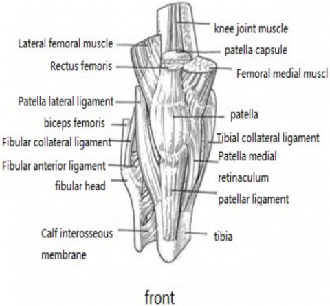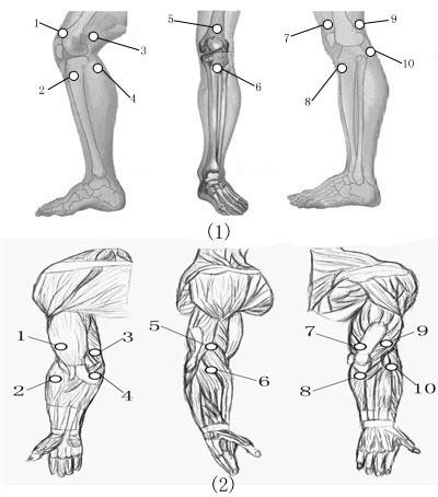 As shown in Figure 1, the elbow joint is mainly composed of the humerus, the humeral joint, the radial shoulder proximal joint and the brachiopodal joint. Being the most vulnerable joint, the knee joint is mainly composed of biceps femoris, gastrocnemius and half-membrane tendon, as shown in Figure 2. In order to better collect the muscle group information of the elbow joint and the knee joint during movement, PVDF sensors are placed on the corresponding muscle group locations. Due to the great range of motion in actual movement, the PVDF sensors need to be fixed well. In this study, thin copper sheets are used. Before the placement, the linkage position needs to be polished with abrasive paper to increase the sense of smoothness. Then, it is washed with acetone. Afterwards, conductive silver is applied to paste the PVDF film on the sensor, with plastic wrap for reinforcement protection. Then, 40 sensors are attached to the elbow and knee joint, as shown in Figure 3.