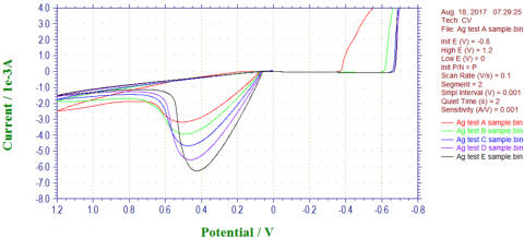 Figure 1. Response curves of the Ag electrode to the flavoring liquids with five different concentrations