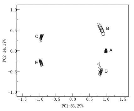 In the one-way analysis of variance (one-way ANOVA), with each sensor as one factor and the response of each sample as a level, there was a 15×6 data matrix for ANOVA to screen the sensors and group the performances. After the sensor arrays were grouped, a 2D principal component score plot was obtained by the principal component analysis (PCA) method to compare the effects of the sensor arrays in distinguishing of the samples before and after optimization. PC1 and PC2 contained the contribution rates of the first and the second principal components obtained in the PCA transformation. The higher the cumulative contribution rate, the richer the sample information covered by the sensor array, and the better the identification performance of the sensor array with respect to the sample. Based on the principal component analysis, the inter-class Euclidean distances between the samples in the sensor principal component score plot were calculated to reflect the identification effect of the sensor array on each sample. According to the PCA and the Euclidean distance analysis results, the optimal sensor array was determined.