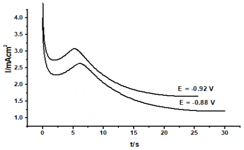 The nucleation of the metal state and the increase of the number of nuclei are indicated with only a slight maximums in the i-t plots. The representative maximums indicate the mechanism of nucleation and the slow increase of the current up to a certain value suggest a three-dimensional growth of the nuclei [11].