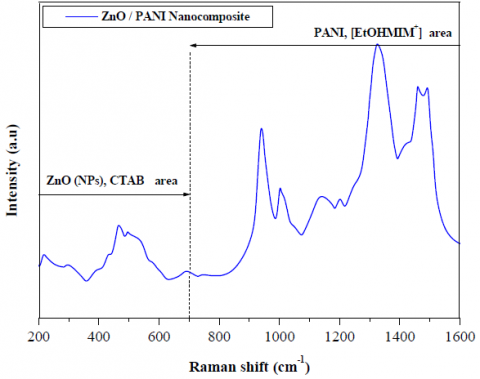 In recent years, the development of inorganic / polymer hybrid materials on nanometer scale has been receiving significant attention due to a wide range of potential applications in optoelectronic devices [1-3] and in field effect transistors [4]. Semiconducting zinc oxide (ZnO) is attracting a lot of attention due to its unique properties such as direct wide band gap (3.37 eV) and large exciton binding energy (60 meV) at room temperature [5]. Due to these properties it has been studied extensively for making optical and electronic devices [6, 7]. Nanostructured ZnO can be synthesized by various methods such as physical, chemical, electrochemical, deposition techniques [8-11]. Many studies on the preparation of polymer nanocomposites have been reported in the quest to develop new advanced materials with improved mechanical, electrical, optical and catalytic properties or to improve conduction mechanism in electronic devices. Polyaniline (PANI) is the most studied polymer because of its relative ease in preparation, good environmental stability [12, 13] and tunable conductivity. The preparation of PANI composites with various oxide materials such as Fe3O4 / PANI, MnO2 / PANI, TiO2 / PANI and ZrO2 / PANI [14, 15], as well as preparation and characterization of ZnO / PANI composites have been published [16-18]. Due to these properties it has been studied extensively for making optical and electronic devices [19- 21]. CetylTrimethyl Ammonium Bromide (CTAB) a cationic surfactant is the most commonly used stabilizing agent in controlling the shape and size of NPs which can play a modified part in the process of organic synthesis of materials [22]. Ionic liquids (ILs) exhibit high chemical and thermal stability, non-volatility, non-flammability, high ionic conductivity, and a wide electrochemical window [23, 24]. Due to these characteristics, they are proposed to improve properties in different fields such as batteries [25], fuel cells [26] and supercapacitors [27]. In this paper, we report the preparation and characterization of ZnO (NPs) synthesized with CetylTrimethyl Ammonium Bromide (CTAB) in 1- (hydroxyethyl)-3-methylimidazolium sulfate [EtOHMIM+] [HSO4-] IL. The structural, morphological optical and photoluminescence properties of ZnO / PANI nanocomposite were investigated using XRD, Raman, SEM and PL analysis. ZnO / PANI nanocomposite so formed resulted in an altogether different optical and structural property. Raman spectroscopy and photoluminescence study were employed as tools to investigate the hybrid effect between ZnO NPs synthesized with CTAB in [EtOHMIM+] [HSO4-] IL and PANI.