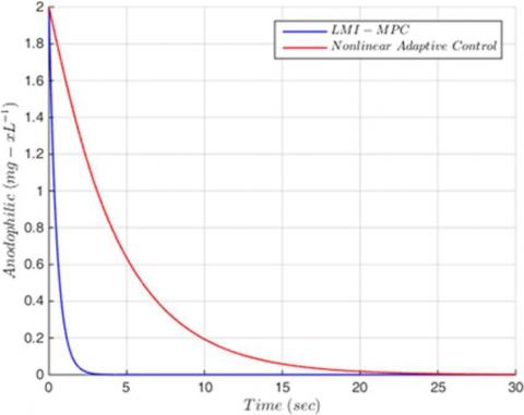 The figures and table above clearly show that reaching the steady state in the proposed method is much less than the adaptive controller, although the time to reach the steady state is close in the case of substrate concentration. The second point in the figures is that there is less error than the adaptive method used for comparison, which serves as another strength for the proposed layout. It is quite clear that the system behavior with the LMI predictive model controller has less error compared to the nonlinear adaptive controller and reaches a stable equilibrium state in a much shorter time.
