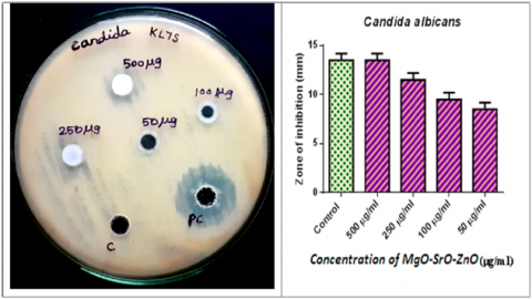 The anti-fungal activity carried out by agar well diffusion method. The prepared nanocomposites was allowed to diffuse out into the medium and interact in a plate freshly seeded with the test organisms. The resulting zones of inhibition will be uniformly circular as there will be a confluent lawn of growth. The diameter of zone of inhibition can be measured in millimeters. Candida albicans, Potato dextrose agar medium, Amphotericin B antimycotic solution was used. Petri plates containing 20ml potato dextrose agar medium were seeded with 24hr culture of fungal strain Candida albicans. Wells were cut and different concentration of MgO-SrO-ZnO (500 μg/ml, 250 μg/ml, 100 μg/ml and 50 μg/ml) was added. The plates were then incubated at 37°C for 24 hours. The anti- fungal activity was assayed by measuring the diameter of the inhibition zone formed around the wells. Amphotericin B was used as a positive control. The values were calculated using Graph Pad Prism 6.0 software (USA).