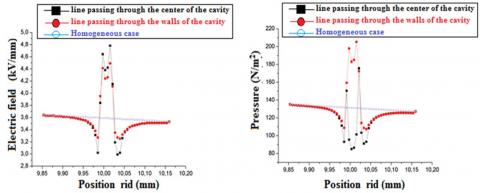 - The electric field and the electrostatic pressure decrease each time one moves away from the cable core, the cavity size has no influence on the values of the two constraints for a given position, and within the diameter of the cavity, the electric field is maximum inside the cavity is decreasing slightly on the walls, the electrostatic pressure is important on the walls of the cavity, On the walls of erosion the field and the electrostatic pressure take values lower than the values of these stresses in the homogeneous insulation. For a given position, note that the cavity size has no influence on the values of the fields and the electrostatic pressure within the limits of the diameters of the cavity chosen.