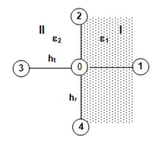 From which we can draw: $\frac{\partial^{2} V}{\partial r^{2}}=\frac{2}{h_{t}^{2}}\left[\frac{\varepsilon_{2}}{\varepsilon_{1}+\varepsilon_{2}} V_{2}+\frac{\varepsilon_{1}}{\varepsilon_{1}+\varepsilon_{2}} V_{4}-V_{0}\right]$