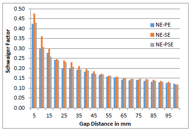 In electrical equipment, distance between live and ground electrode is differed according to voltage class requirements. Therefore, it is necessary to understand the influence of gap distance on Schwaiger factor. To understand the effect of gap distance between electrodes on Schwaiger factor, Needle to Spherical electrode system is analyzed for different gap distance in the range from 5 mm to 100 mm. The obtained results are shown in Figure 3. The same stress volume principle discussed in section 4.4 is applicable here as well. As distance between electrodes increases, area under electrodes which is stressed is increased and therefore partial discharge probability increases with increase in gap distances.