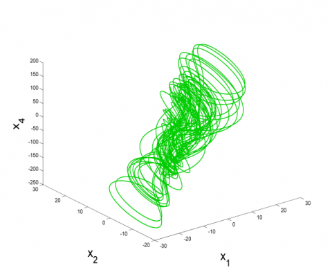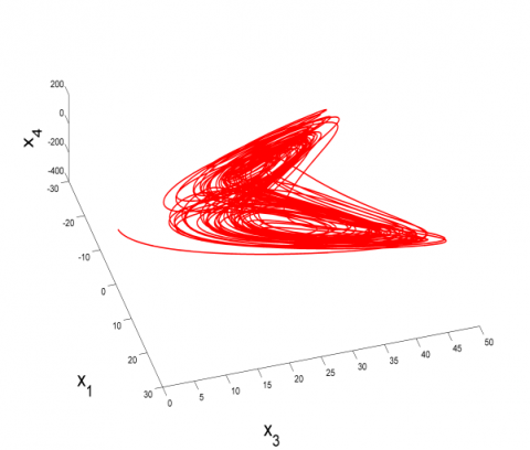 Figure 1. 3-D attractor of the system (1) in the $\left( x _ { 1 } , x _ { 3 } , x _ { 4 } \right)$ space