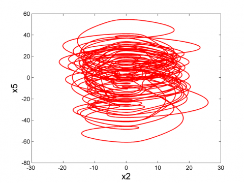 Figure 4. 2-D attractor of the system (1) in the $\left( x _ { 2} , x _ { 5} \right)$ plane