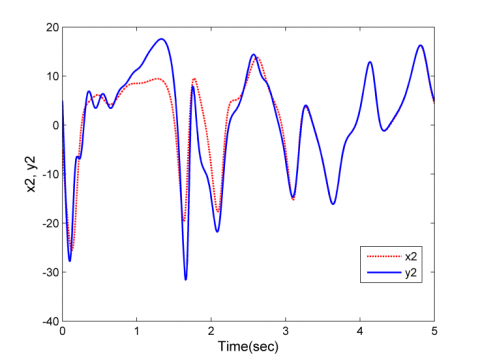 Figure 8. Complete synchronization of the states $x _ { 2 }$ and $y _ { 2 }$ for the Lorenz systems (1) and (4)