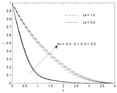 Figure 10 presents the effects of Lewis number (Le) and chemical reaction parameter (Kc) on volume fraction profiles. A sharp fall in volume fraction occurs due to higher value of Lewis number. One remarkable feature is that the volume fraction increases under the influence of exothermic reaction (Kc>0) and decreases for endothermic reaction (Kc<0).