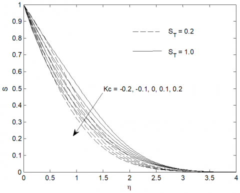 Figure 11 depicts the effects of chemical reaction parameter (Kc) and Soret number (ST) on concentration profiles. It is observed that destructive chemical reaction parameter Kc (Kc>0) decreases the concentration profiles while concentration increases with increasing values of generative chemical reaction parameter Kc (Kc<0). It is also seen that an increase in the Soret number results in a significant increase in the concentration distributions within the solutal boundary layer.