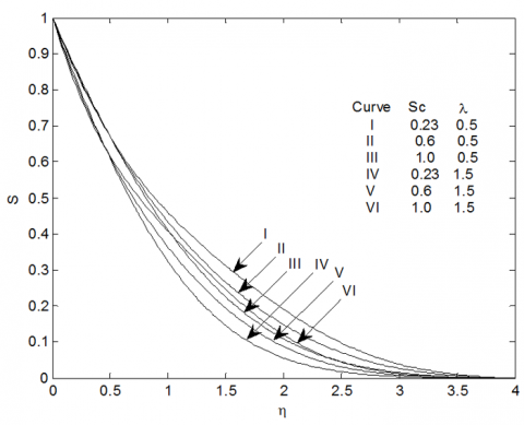 Figure 12 displays the results of Schmidt number (Sc) and mixed convection parameter (λ) on concentration profiles. The higher Sc representing heavier species lowers down the concentration level at all the layers when λ<1, whereas reverse effect is observed in case of λ>1.