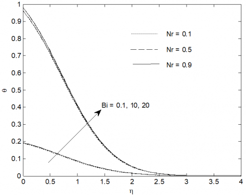 Figure 4 reveals the influence of nanoparticle buoyancy ratio (Nr) and regular buoyancy ratio (Nc) on velocity distribution. It is observed that thermal boundary layer decreases with an increasing value of Nr and increases with increasing values of Nc.