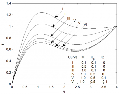 Figure 3 exhibits the effect of magnetic parameter (M), porosity parameter (Kp) and chemical reaction parameter (Kc) on velocity distribution. The interaction of magnetic field with an electrically conducting flowing fluid induces a voltage across the magnetic field. The current generated by the induced voltage interacts with magnetic field and producing a resistive force to slow down the motion of the fluid. Therefore, an increase in M leads to decrease the velocity profiles in the flow domain. Further, porous medium resists the fluid flow also. It is also seen that the velocity increases with an increasing values of constructive chemical reaction parameter Kc (Kc<0) whereas reverse effect is observed is case of destructive chemical reaction parameter Kc (Kc>0).