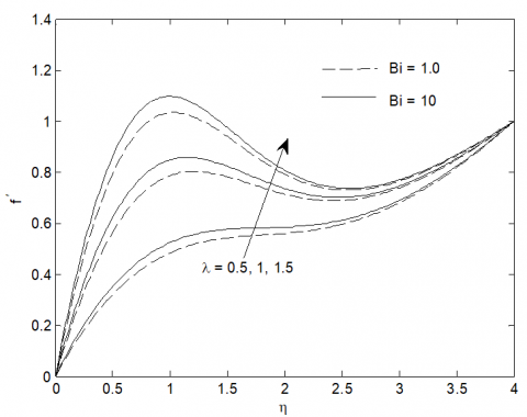 Figure 5 exhibits the impact of Biot number (Bi) and mixed convection parameter (λ) on velocity profiles. It is observed that both the parameters enhance the velocity. The Biot number is the ratio of momentum diffusivity through v and thermal diffusivity through k. Here, momentum diffusivity is accelerated overriding the thermal conductivity of nanofluid, resulting accelerated fluid motion.