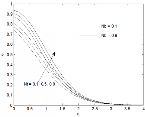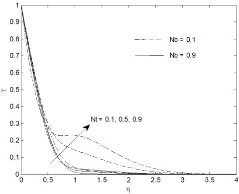 From Figure 6 it is clear that Brownian motion (Nb) and thermophoresis parameter Nt increase the temperature indicating more dispersion of thermal energy into flow domain. It is also revealed that thermal energy is dissipated into flow due to concentration and temperature differences between boundary layers and corresponding ambient conditions as well as Brownian diffusion coefficient and thermophoresis rather than kinematic viscosity (υ) of the base fluid responsible for momentum diffusivity.