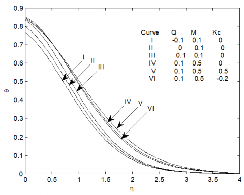 Figure 7 depicts the influence of magnetic parameter (M), heat source/sink parameter (Q) and chemical reaction parameter (Kc) on temperature distributions. It is noticed that an increase in the value of magnetic parameter enhances the temperature of the fluid. The temperature profiles increase with heat source parameter Q(Q>0) on the contrary, the temperature decreases with heat sink parameter Q(Q<0). It is also seen that the temperature increases with an increase in the destructive chemical reaction parameter Kc(Kc>0) and decreases in case of constructive chemical reaction parameter Kc(Kc<0). It is natural in the process of exothermic reaction; the heat energy is evolved that enhances the fluid temperature. The reverse thermo-physical conditions is observed for endothermic reaction.