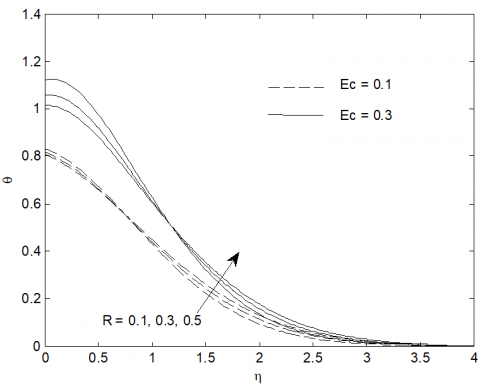 Figure 8 presents the effect of thermal radiation parameter (R) and Eckert number (Ec) on the temperature profiles. The effect of radiation parameter near the bounding surface (0<η<0.65) is to decrease the temperature and beyond, the reverse effect is observed. The point of intersection of the profiles drifted away from the boundary with higher value of Ec.