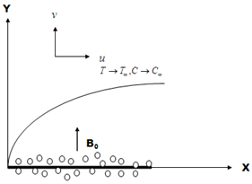 Consider the two dimensional steady incompressible MHD power-law nanofluid on a non-conducting stretching sheet y=0 embedded in porous medium. The flow of fluid is confined in the region y>0. The velocity, temperature and concentration of the stretching sheet are $u_{w}(x)=U_{0} x^{n}(n$ being the powerlaw index $), T_{f}$ and $C_{f}$ respectively. A magnetic field $B=$ $B_{0} x^{\frac{n-1}{2}}$ is applied normal to the sheet. Further, the fluid assumed to be slightly conducting, the magnetic Reynolds number is much less than unity and hence the induced magnetic field is negligible. The coordinate system describing the flow model is given in Figure 1.