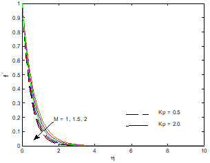 Figure 3. Effects of M and Kp on the velocity ${f}'\left( \eta \right)$ profile