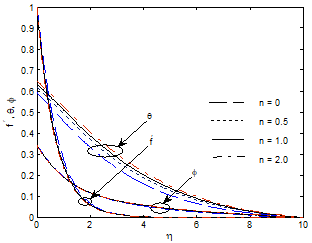 Figure 4. Effect of n on the velocity ${f}'\left( \eta \right)$, temperature $\theta \left( \eta \right)$ and concentration $\phi \left( \eta \right)$ profiles