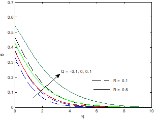 Figure 5. Effects of R and Q on the temperature $\theta \left( \eta \right)$ profile