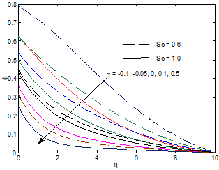 Figure 8. Effects of $Sc$ and $\gamma $on the concentration $\phi \left( \eta \right)$ profile