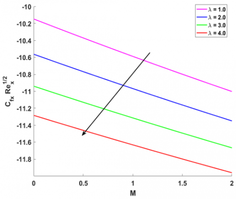 Figure 11. Effect of λ against M on $C_{f x} \operatorname{Re}_{x}^{\frac{1}{2}}$