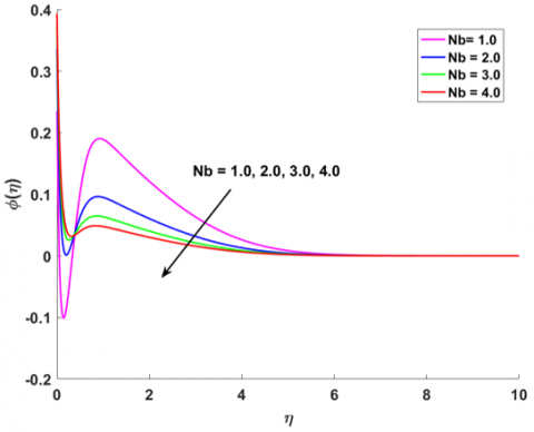 As far as the behavior of nanoparticles concentration $\varphi(\eta)$ is concerned, Figures 8-10 represent $\varphi(\eta)$ profiles in relation to the Brownian motion parameter Nb, thermophoresis parameter Nt and Schmidt parameter Sc for three-dimensional MHD flow of an incompressible Cross nanofluid. The $\varphi(\eta)$ profiles for different Brownian motion parameter Nb are depicted in Figure 8. Increment in Nb decreases the nanoparticles concentration $\varphi(\eta)$ leading to shrinkage of CBL. Physically, the Brownian motion makes the particles to move in opposite direction of the concentration gradient and make the nanofluid more homogenous. Such force leads to low concentration gradient and therefore lesser nanoparticle concentration distribution. However, the profiles of $\varphi(\eta)$ in response to Nt exhibit opposite trend compared to that of Nb (See Figure 9). From physics point of view, larger thermophoresis parameter implicates stronger thermophoretic force. Because of stronger thermophoretic force avalanche of fluid particles are pulled away from hot surface to the cold region and contribute to the enhancement of nanoparticle concentrations. Here, the only difference between the two profiles is that the variation of $\varphi(\eta)$ due to Nt provide more intensification compared to the variation due to Nb. Increase in Schmidt number Sc resulting in diminishing of $\varphi(\eta)$ leading to decreased CBLT (See Figure10). Schmidt number is related with Brownian movement. A rise in Schmidt number prompts poor Brownian movement which in turn yields a decay of nanoparticle concentrations. In other words, fluids with larger Schmidt number indicating more molecular diffusivity makes nanoparticles concentration decline. Why is there a peak $\phi_{\max }(\eta)$? This is because at certain Sc, due to fixed DB nanoparticle concentrations contiguous to the stretched sheet exceed that of the ambient fluid.
