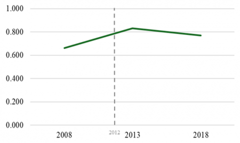 In the efficiency measurements for 2008 (prior to designation), only Tecate and Chignahuapan achieved full efficiency. In 2013, Tecate, Loreto, Yuriria, and Lagos de Moreno reached full efficiency; and in 2018, Jiquilpan de Juárez, Tecate, Loreto, Tequisquiapan, and Yuriria achieved full efficiency. These results indicate that the PM designation positively impacted the number of PMs that improved their efficiency. The analysis of average efficiency shows an increase in the efficiency ratio from 2008 to 2013, followed by a decrease in 2018. This suggests that the designation has a positive impact on increasing efficiency.