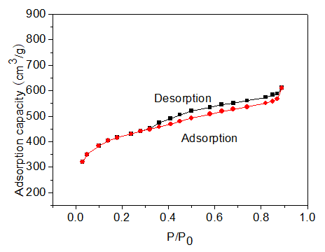 Figure 2 is N2 adsorption-desorption isotherms of porous materials with carbon base ratio of 1:4. From the isotherms, adsorption phenomenon appeared under P/P0 less than 0. 15, which indicated the materials surface had micropores. With the increasing of relative pressure, the adsorption capacity of porous materials continue to increase until the relative pressure is 0. 95. In addition, it is found that the adsorption curve and desorption curve are not coincident, there is a clear adsorption desorption hysteresis loop, which shows that the surface of the porous material contains a large number of mesoporous structure. According to the structural parameters of the materials, the materials is a kind of mesoporous carbon with high specific surface areas.